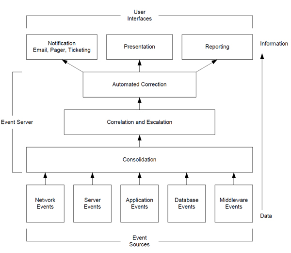 Event management is the process of managing the flow of raw data so that it becomes useful information. For many organizations, this data identifies faults, performance problems, and security alerts. The raw feeds of information may arrive from networking equipment, server hardware, operating systems, databases, middle ware, and applications. Once received, it goes through a series of stages that convert this data from its raw form into alerts, tickets, and reports that provide an organization the information they need to quickly solve the important problems to increase availability and create value.